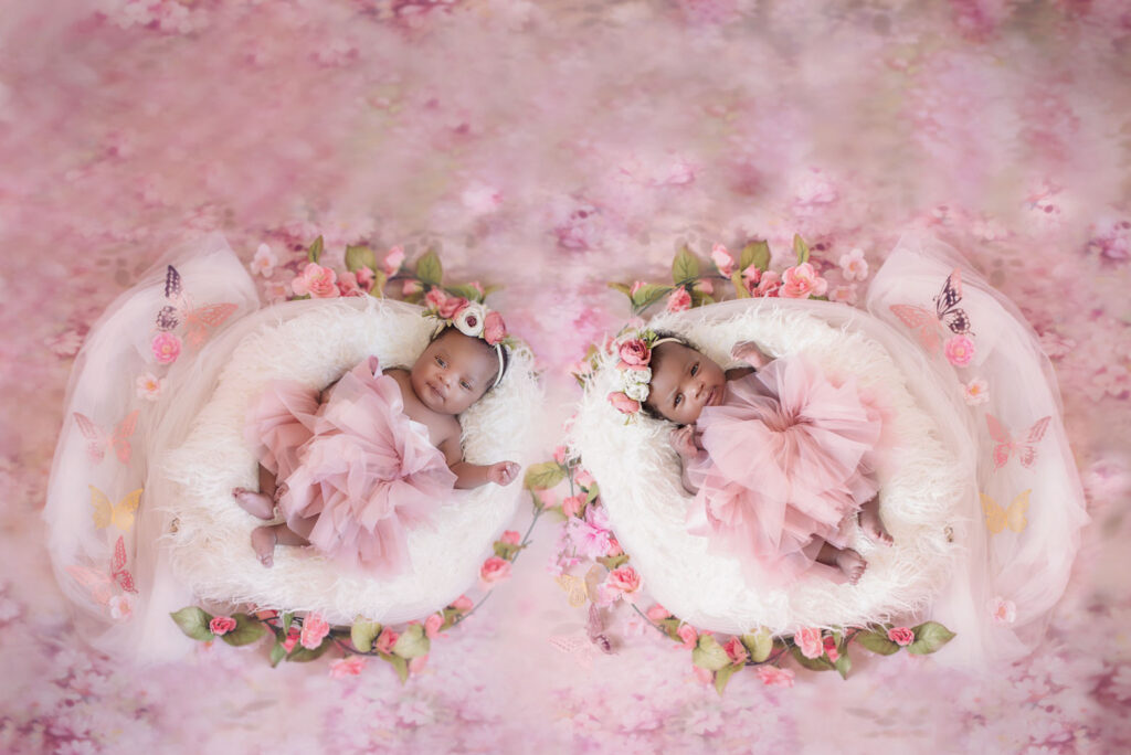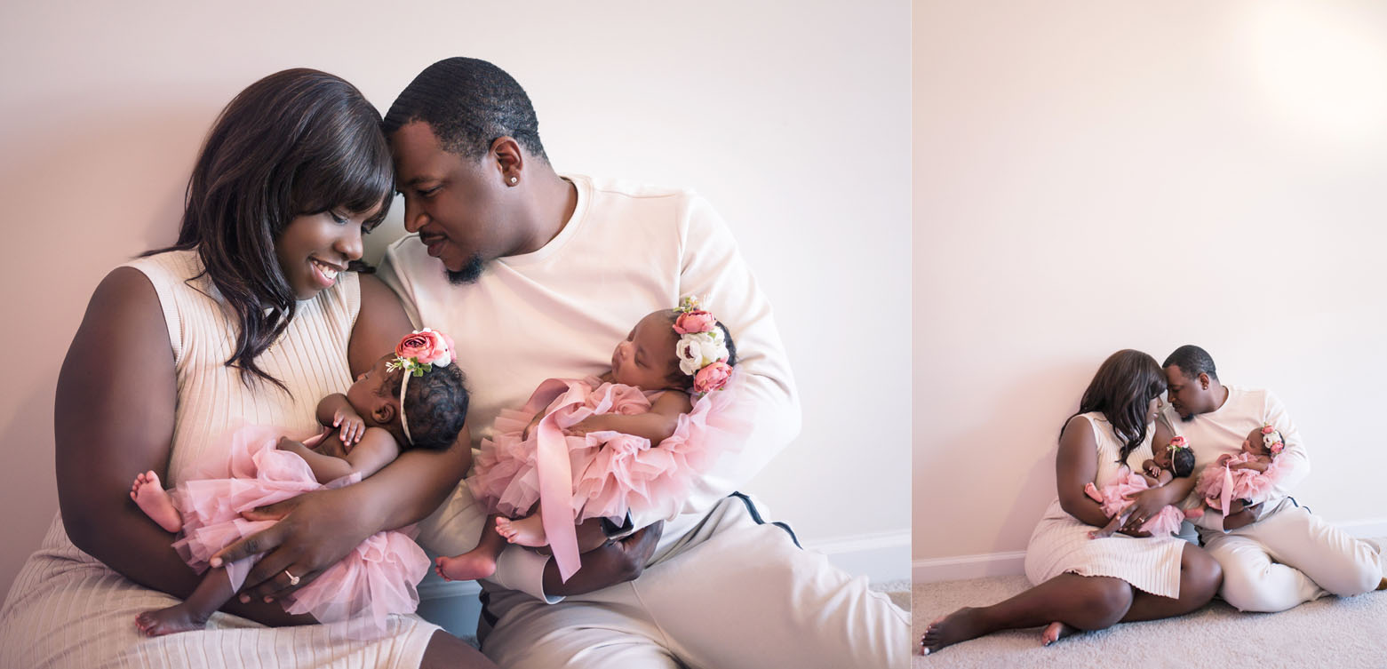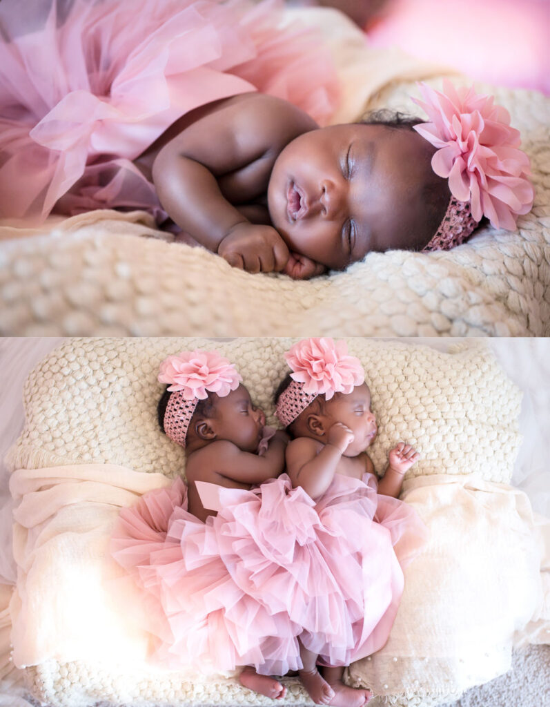 Check out these sweet little double miracles above: God knew the desires of this couple’s hearts, and when it seemed uncertain or impossible, they were blessed beyond measure with twins. There’s something to be said about God’s mysterious timing. I was honored to capture some of Claire + Chloe’s first photos in the upstairs of our personal home as a tiny cozy ‘studio’ We used a few little frilly props while the girls snuggled.